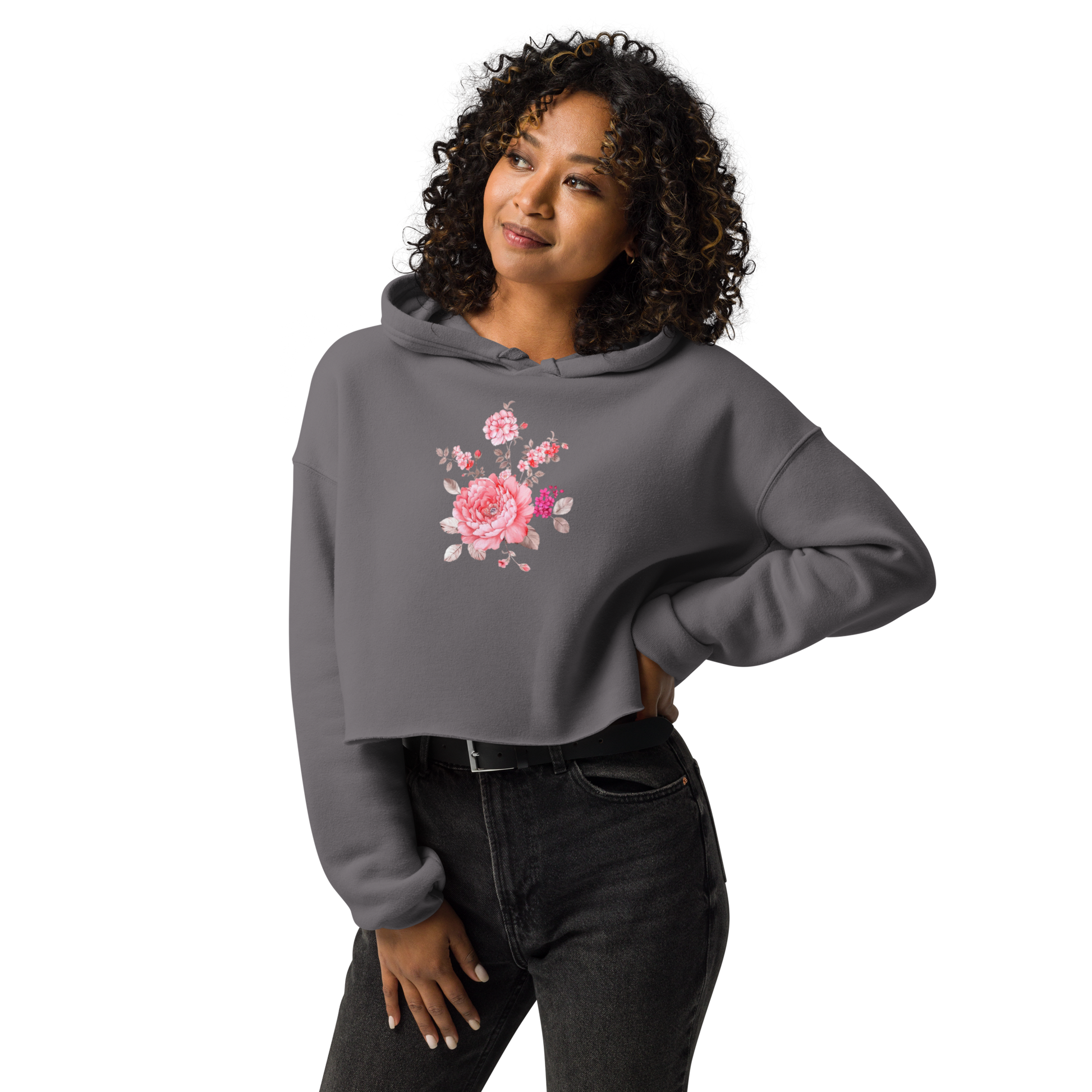 A cozy, gentle-fit cropped hoodie adorned with soft-petaled peonies that whisper effortless elegance.